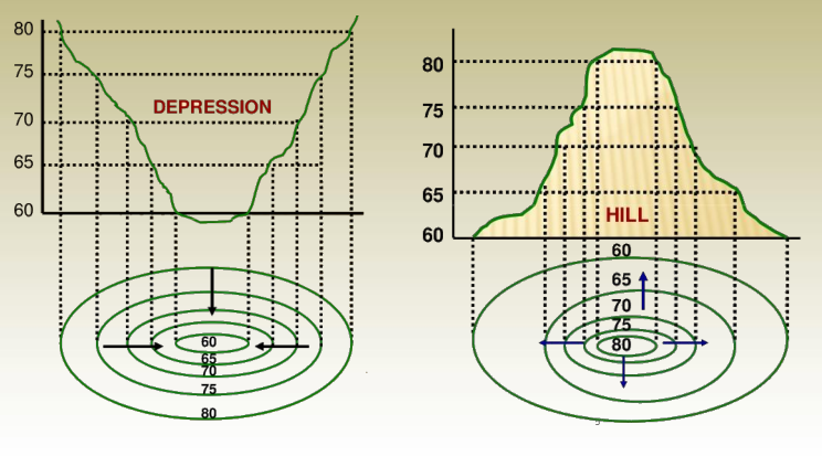 5. Depressions and hills look the same. One must note the contour values to distinguish the terrain.