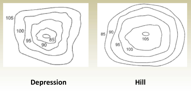 • In Figure (b), the contours show decreasing elevations toward the center, indicating a depression or sinkhole.