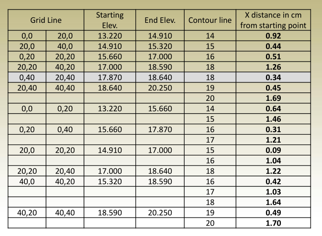 1. Find the exact location of contour points on all grid lines, and then connect between points of the same elevation. e.g.: To determine the location of contour points on the first grid line: