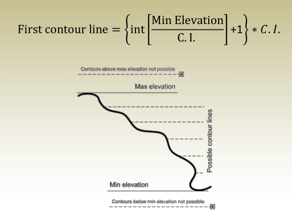 1. Identify minimum elevation and maximum elevation of the grid points to determine contour lines with consideration of the contour interval.
