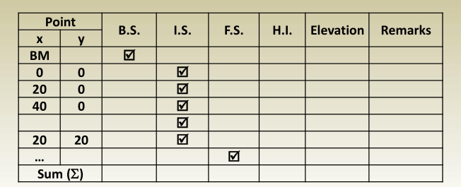 • All readings are filled in a differential leveling table where the elevations of points are computed. Computational checks must be made and misclosures adjusted