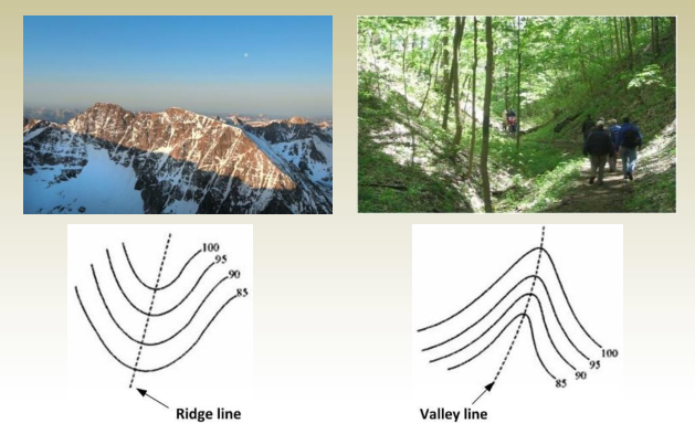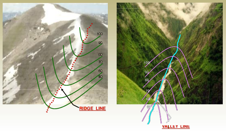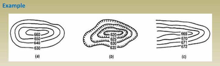 • In Figure (c), the elevation drops along the contour lines, which means it’s a valley. If the elevation pattern were reversed, the same shape would represent a ridge.