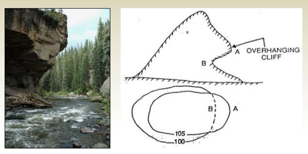 b. They will overlap at a cave or overhang. When contour lines overlap, the lower elevation contour should be dashed for the duration of the overlap